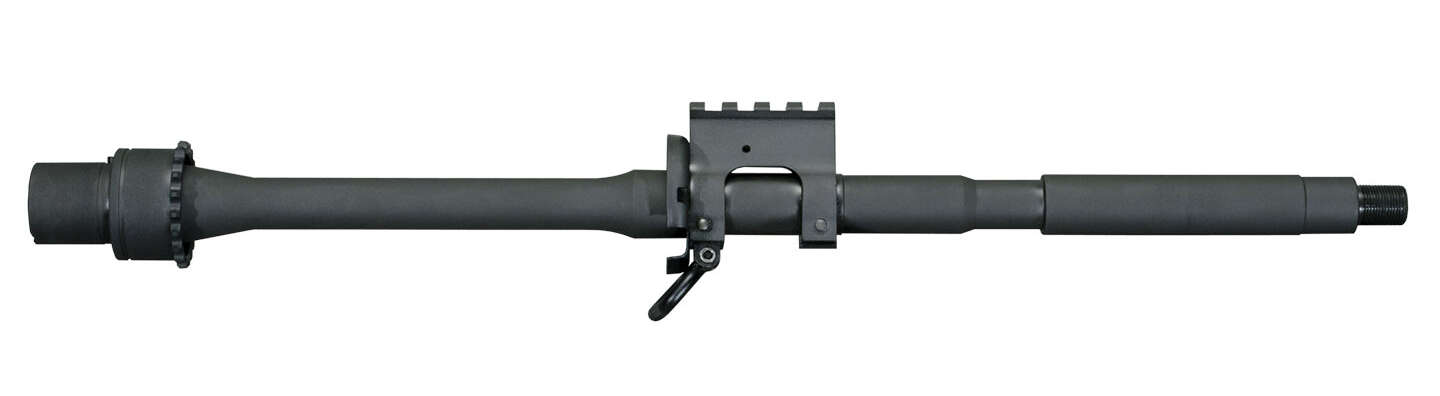 This is the Barrel from Our “SRC” Rifle, similar to our 16” M4 profile barrel but includes a Picatinny Rail Gas Block (attached onto the barrel using taper pins) to which you can mount a variety of accessory front sights. Or, leave it “bare” if you intend to shoot only with a scope. Barrel material is 4150 Chrome Moly Vanadium 11595E Steel, and it is Chrome Lined in both Bore and Chamber for long wear and ease of cleaning. Button rifling is 1 turn in 9 inches – right hand twist for optimum accuracy with a wide range of .223 / 5.56mm ammunition. A Black Manganese Phosphate finished is applied for protection against rust and corrosion. This barrel – machined in the M4 Profile – includes the Barrel Extension (with M4 Feed Ramps), Barrel Nut, Front Handguard Cap, Picatinny Rail Gas Block with Sling Swivel. The muzzle is threaded 1/2” x 28 T.P.I. to accept a variety of flash hiders or muzzle brakes.